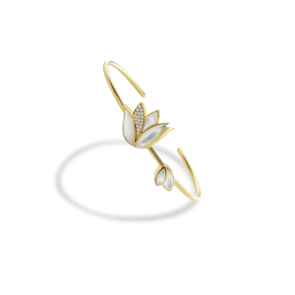 Adorn yourself with this exquisite yellow gold bangle, elegantly crafted with mother of pearl petals and diamond accents, perfect for adding a touch of nature-inspired sophistication to your look.
