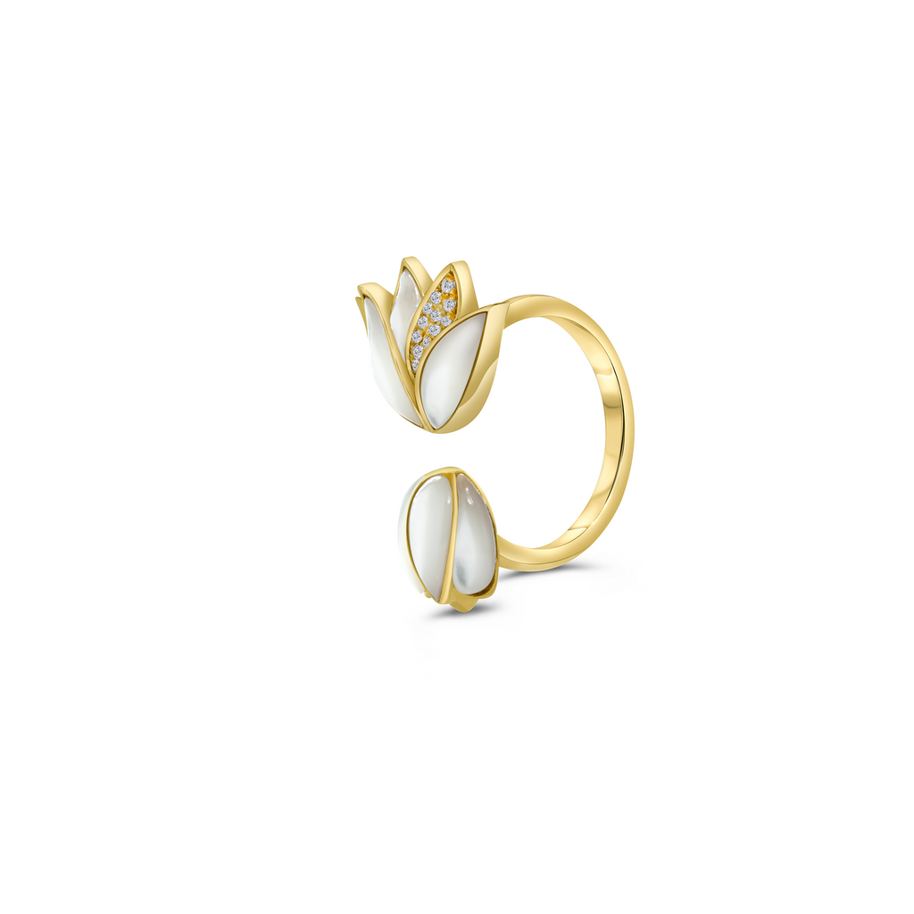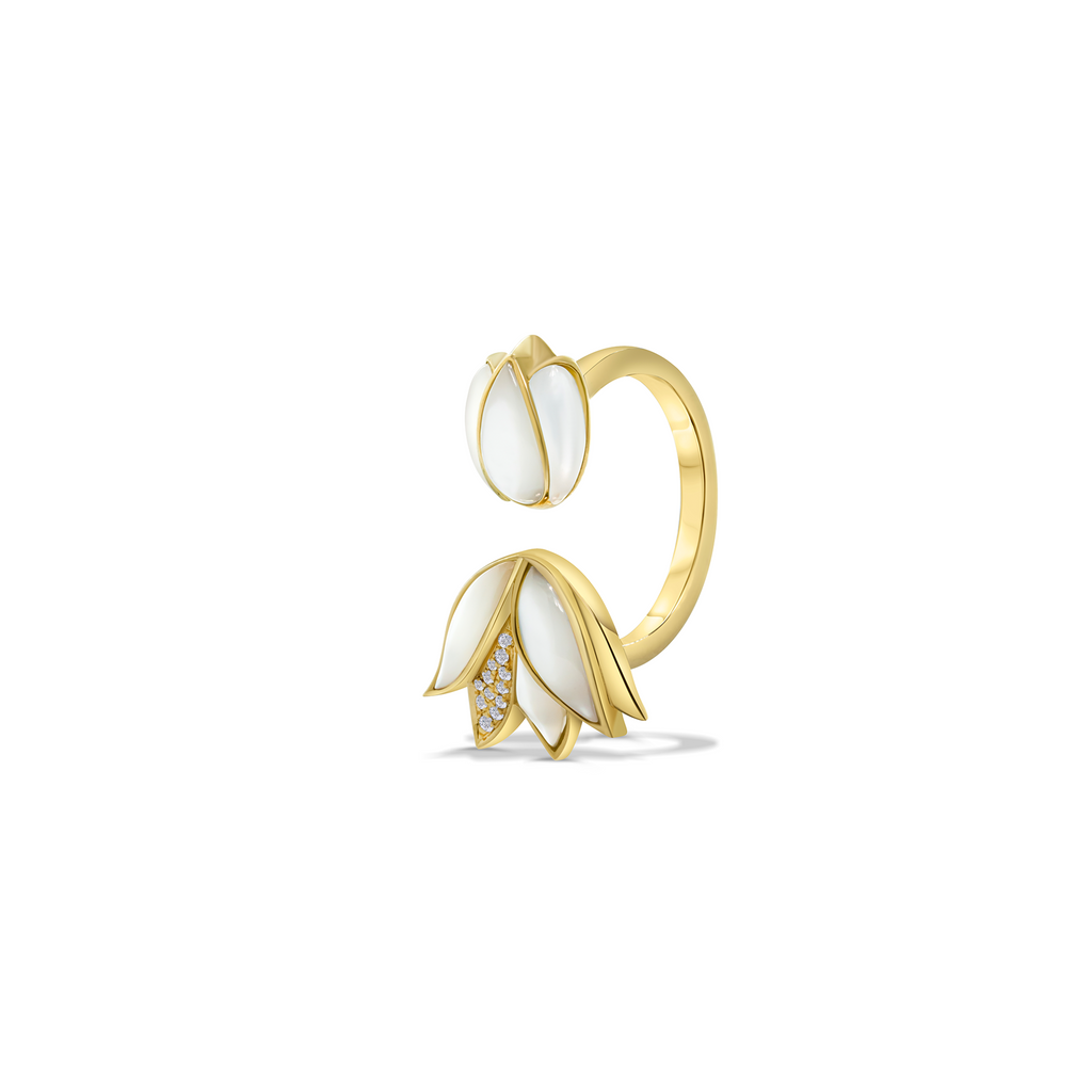 Experience the allure of elegance with this golden leaf ring, featuring mother of pearl accents that capture the serene beauty of nature.