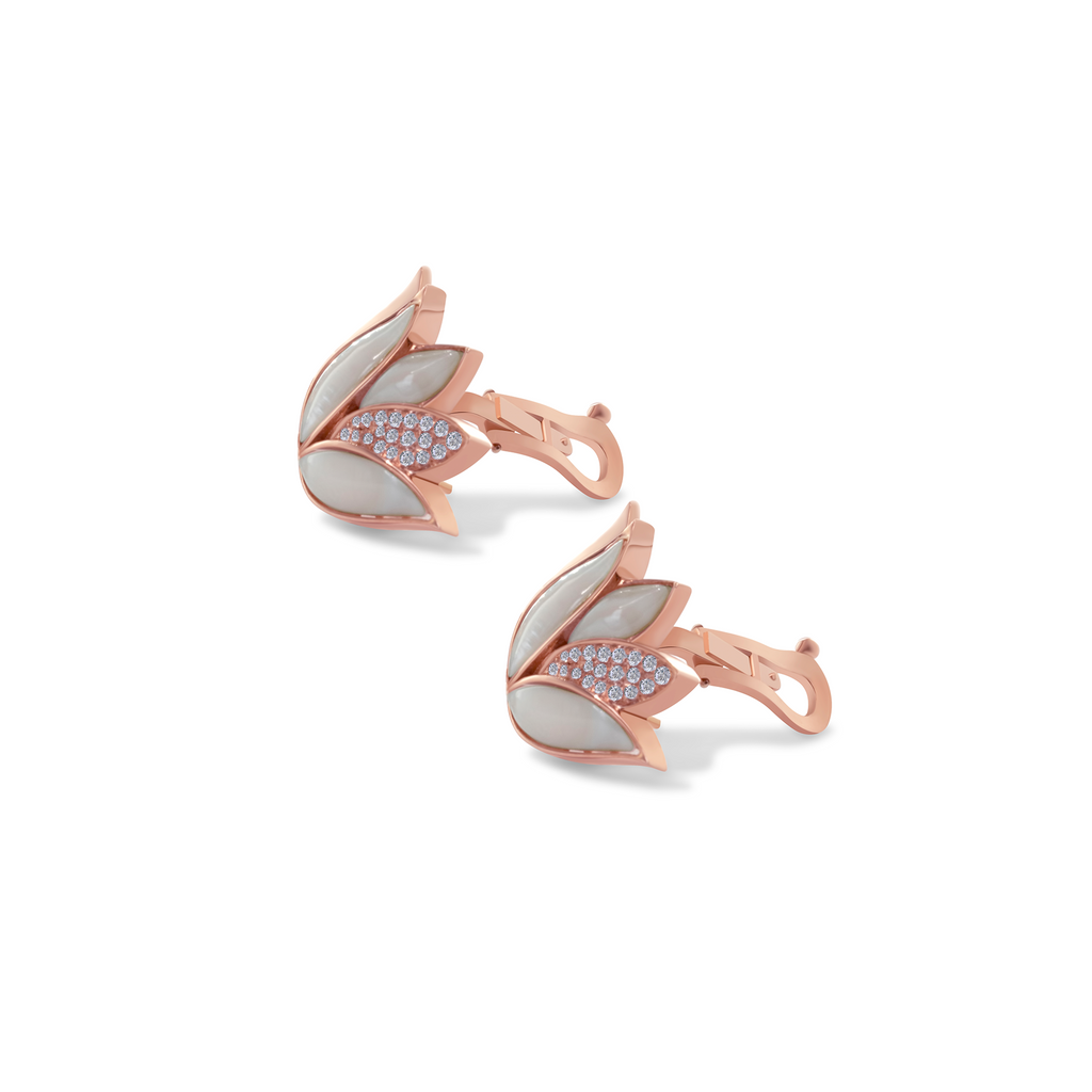 Step into the limelight with these stunning rose gold earrings, featuring mother of pearl inlays and diamond embellishments, designed to mimic the delicate form of unfolding petals.